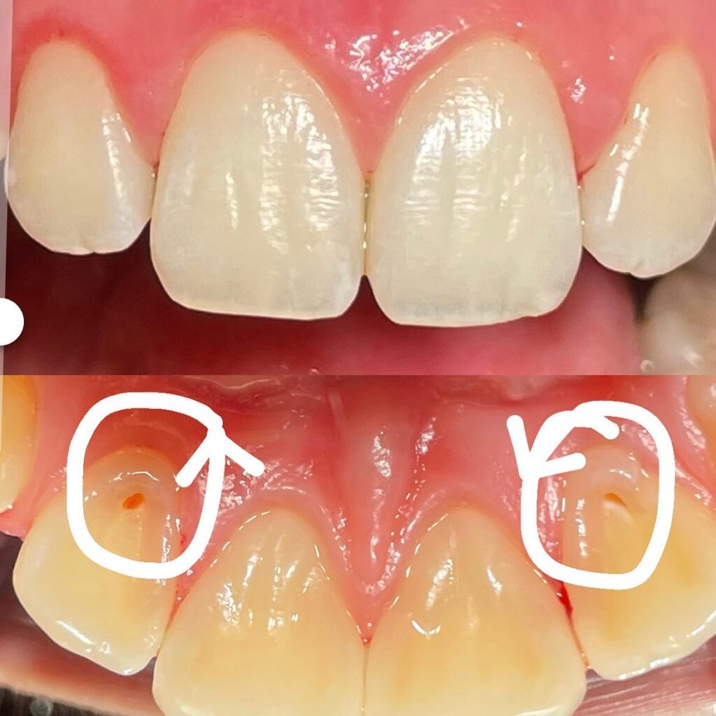 Andrebbe tutto bene ma durante l’igiene sotto un accumulo di placca mi compaiono questi 2 buchetti sulla parte interna degli incisivi.
