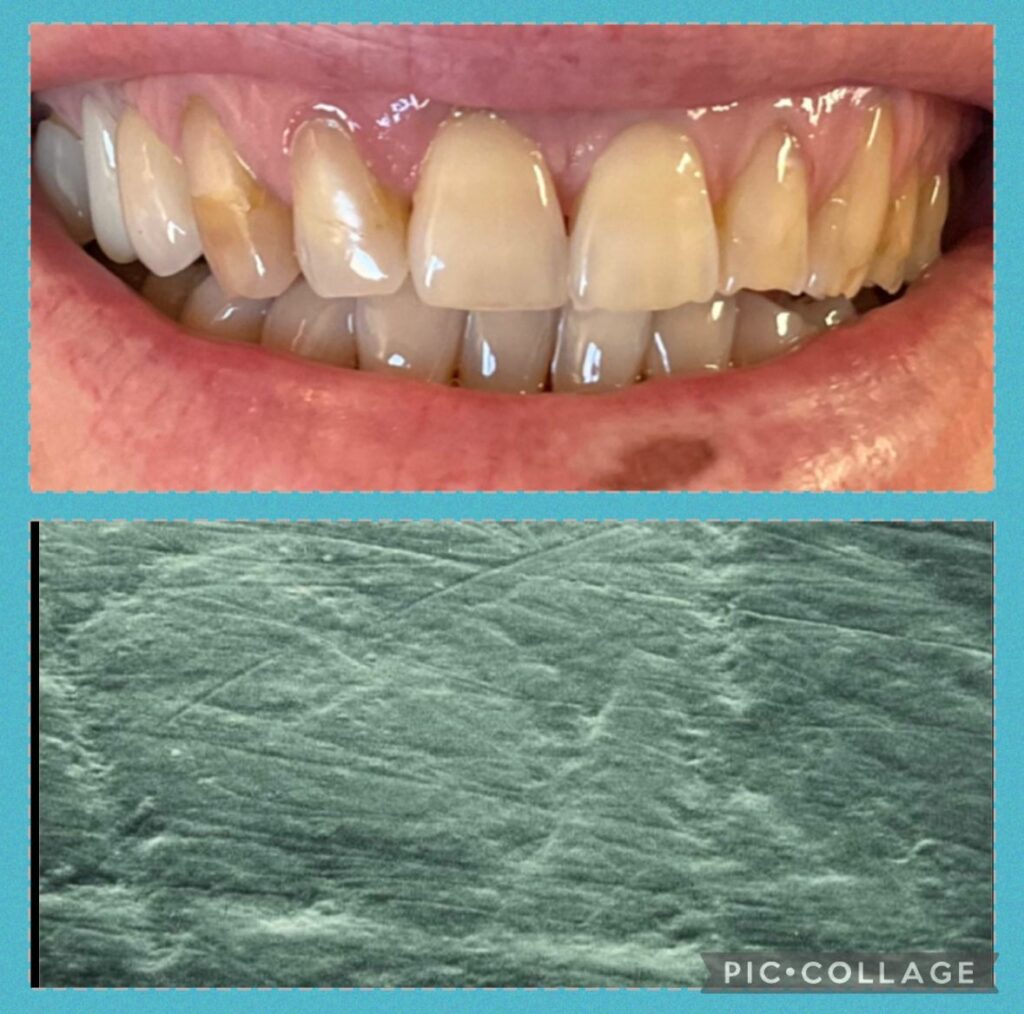 Nell’immagine puoi notare la bocca di una signora che usava x schiarire i denti del bicarbonato con il succo di limone.